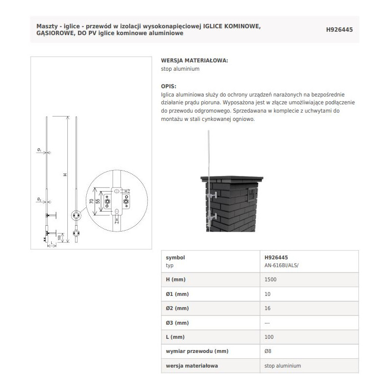 Iglica aluminiowa służy do ochrony urządzeń narażonych na bezpośrednie działanie prądu pioruna. Wyposażona jest w złącze umożliwiające podłączenie do przewodu odgromowego. Sprzedawana w komplecie z uchwytami do montażu w stali cynkowanej ogniowo.
