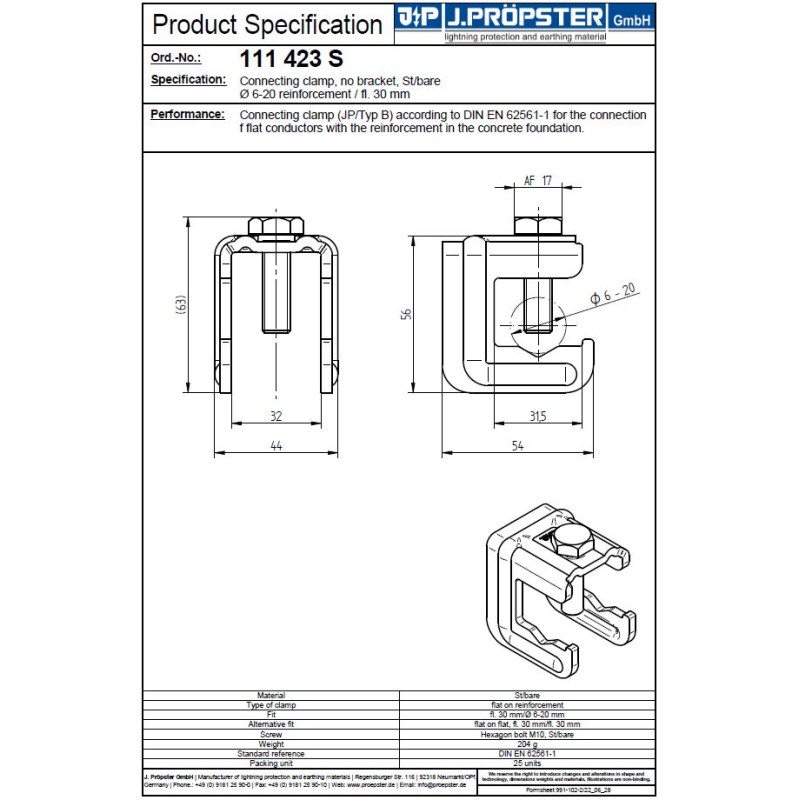 Uchwyt bednarka-drut marki J. PRÖPSTER to wysokiej jakości element montażowy zaprojektowany z myślą o trwałym i bezpiecznym łączeniu przewodów odgromowych z elementami zbrojenia w fundamencie betonowym. Produkt spełnia rygorystyczne wymagania normy EN 62561-1, co gwarantuje jego niezawodność i odporność w systemach ochrony odgromowej.