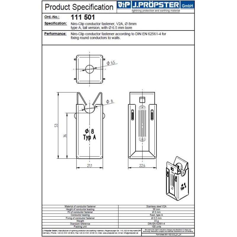Opis: Uchwyt zatrzaskowy Niro-Clip zgodny z DIN EN 62561-4 do przewodu do blachy, konstrukcji drewnianej lub innych.